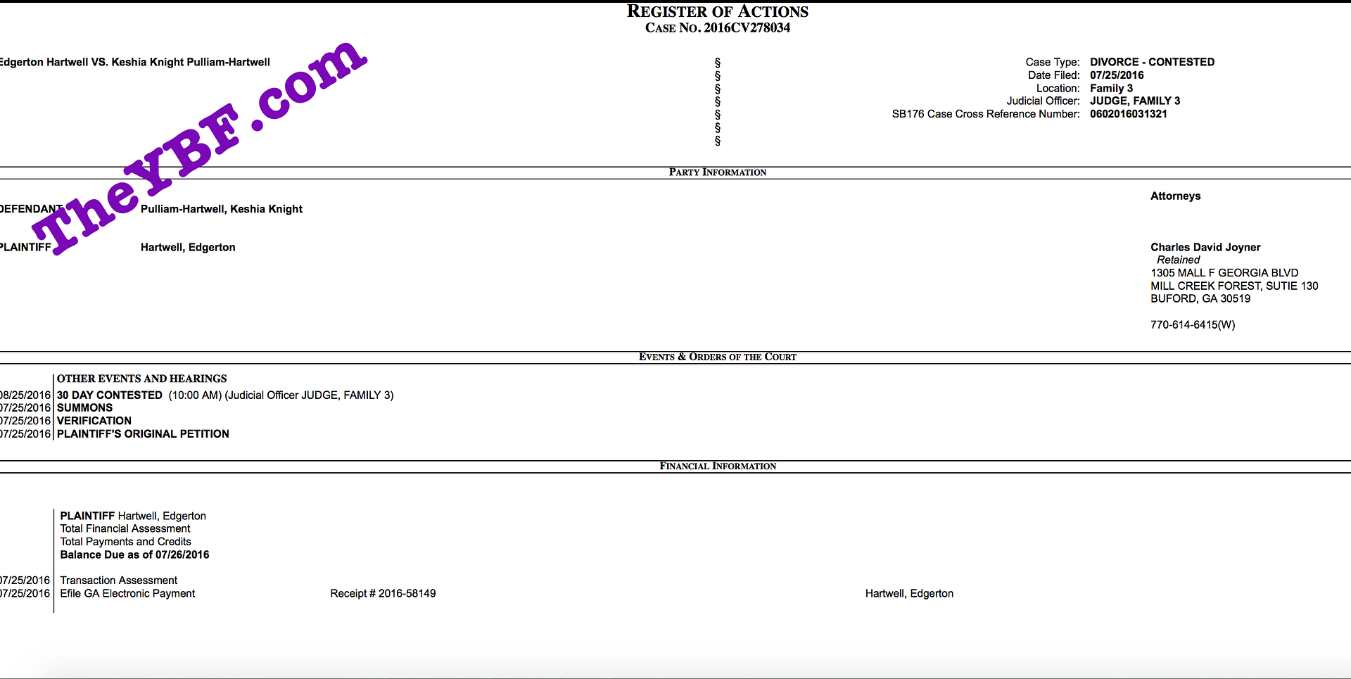 We've learned that former NFL linebacker Ed Hartwell filed divorce papers in a Fulton County, Georgia courthouse this morning. He filed the divorce complaint under Edgerton Hartwell II and cited irreconcilable differences, "such as constant disagreements on life changing decisions that couples typically make together."