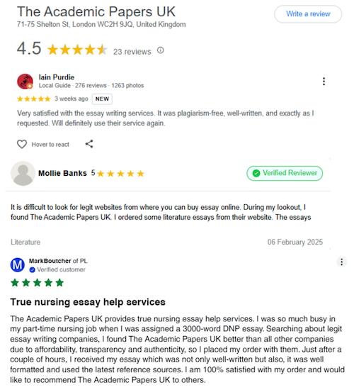 UK Students consistently acclaim The Academic Papers UK for its reliability and affordability. Many students mention how this essay writing service helped them meet tight deadlines. Their positive feedback often mentions the professionalism of UK native writers, the originality of essays, and the ease of ordering. They have thousands of positive reviews on their website, Google Business, ComplaintsBoard, Reseller Ratings and Bark.